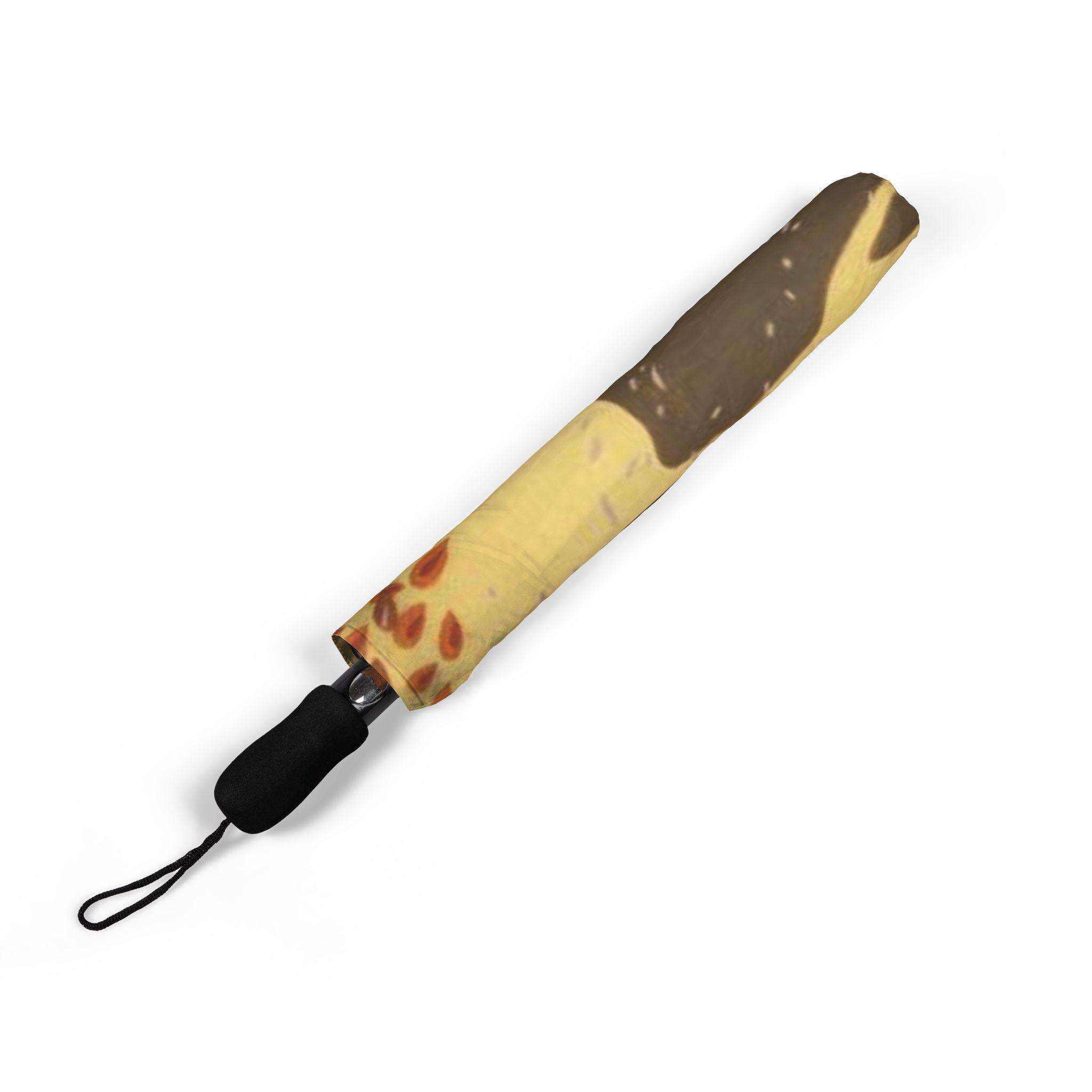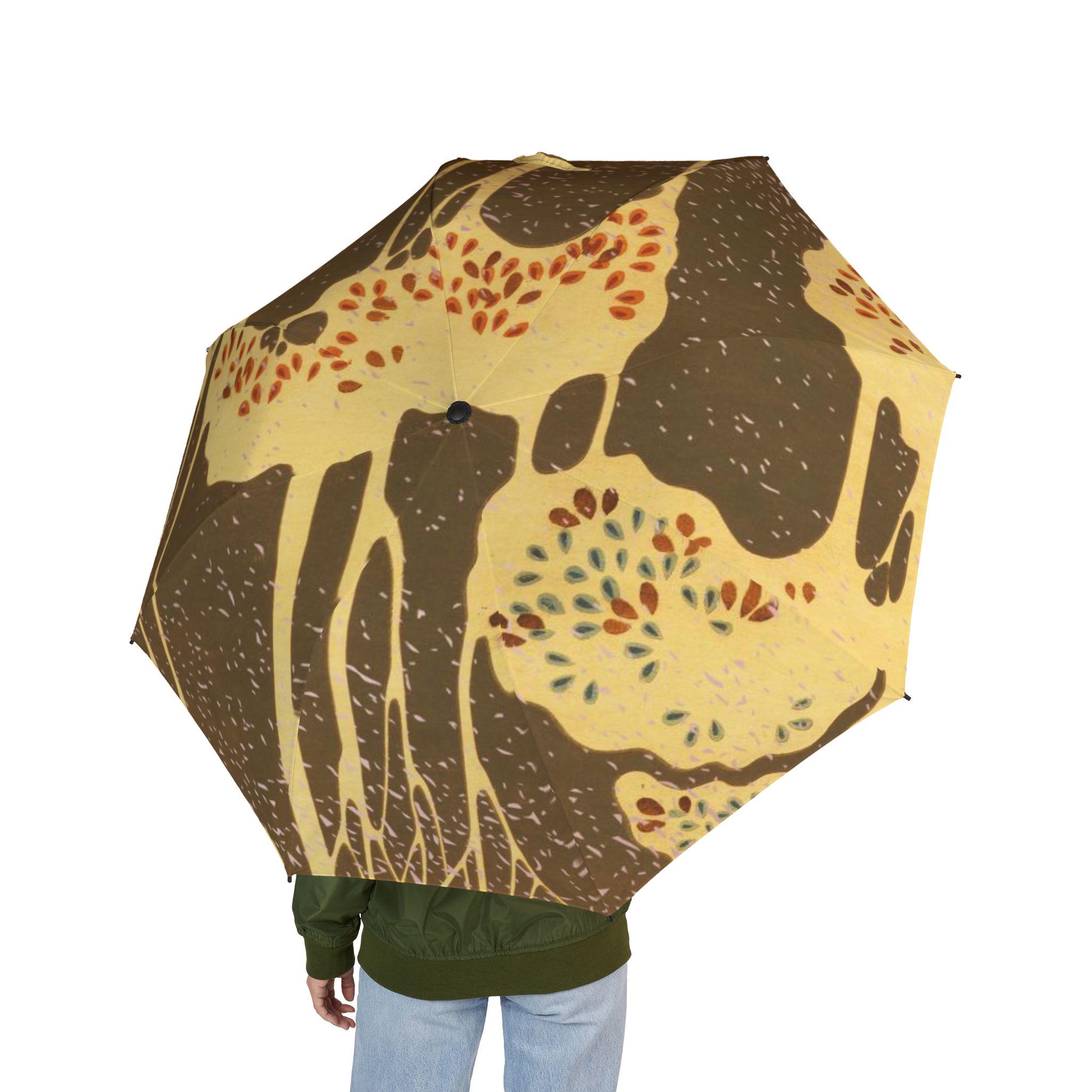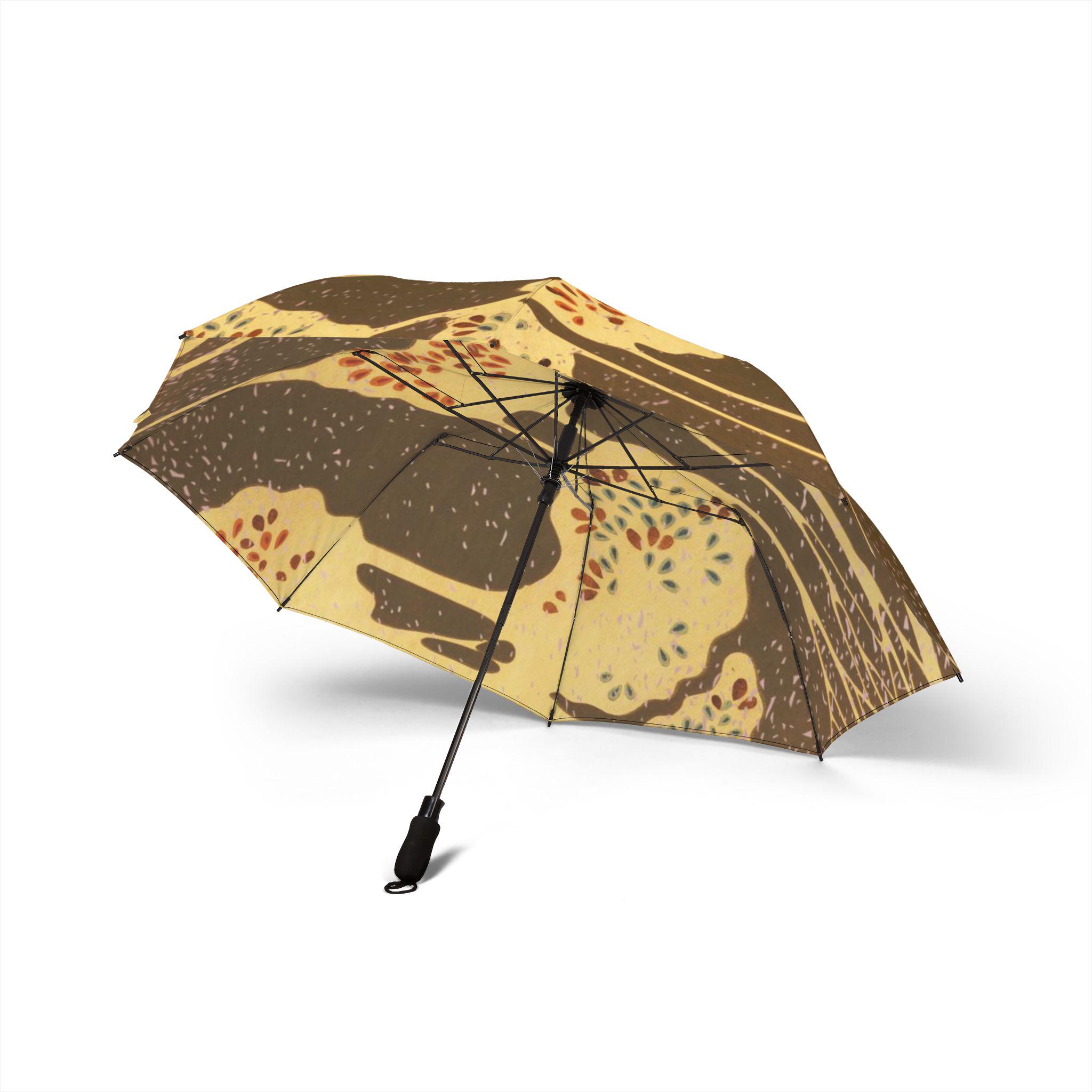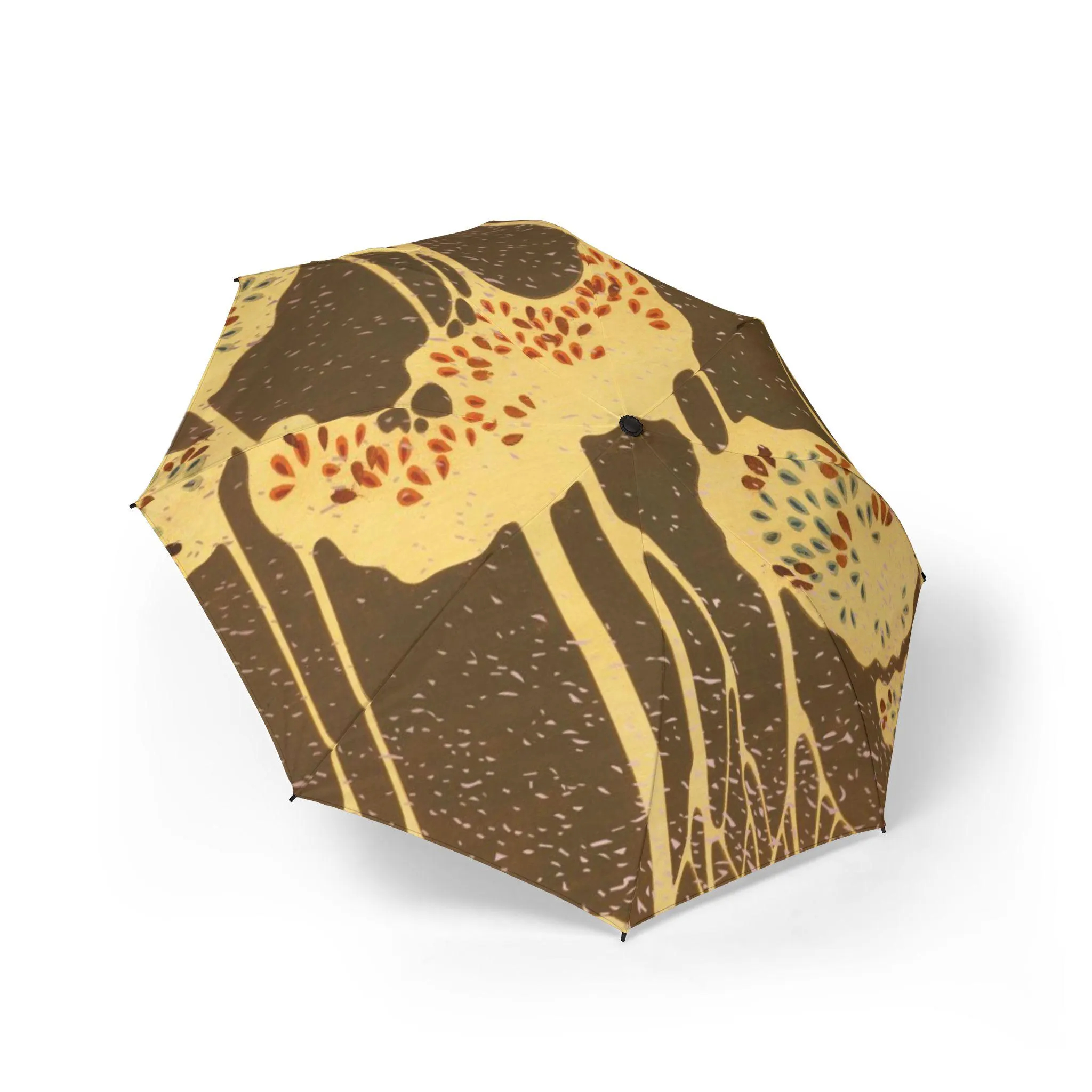 The umbrella surface is presented with abstract art strokes, with a brown background, flowing yellow tones and colorful spots, like paint splashed on the canvas, breaking the conventional umbrella surface design. It is a rain and sun protection tool, and a walking art installation, injecting artistic inspiration into daily travel.
