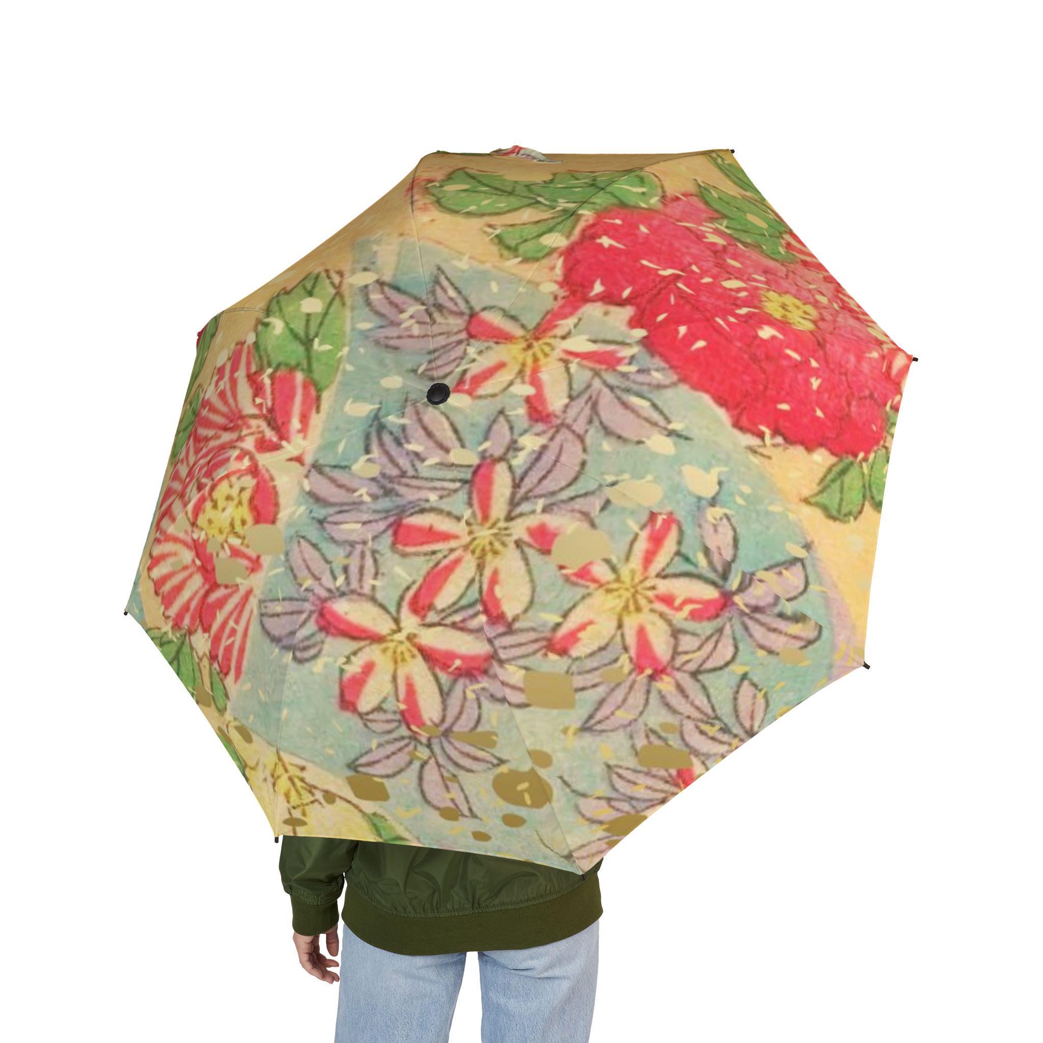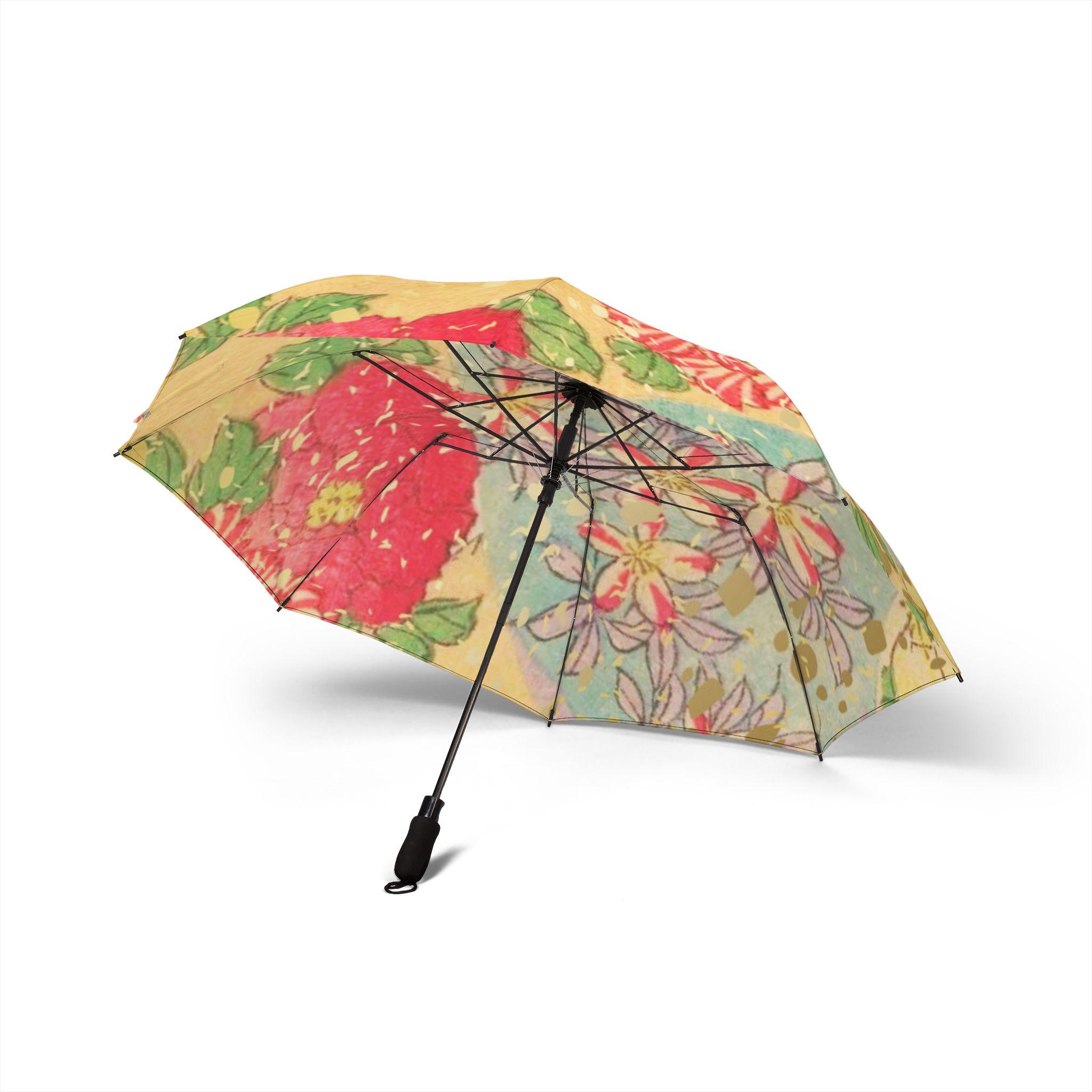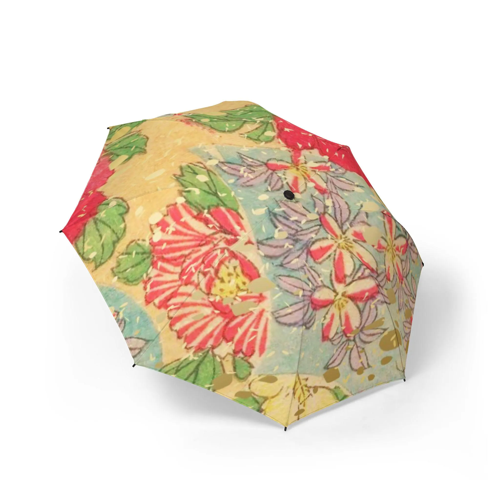 The umbrella surface reproduces the traditional Japanese Yuzen dyeing technique, taking the image of the flower arrangement in the Edo period – bright yellow like the background color of Japanese paper, smudged with crimson peonies and lavender platycodon, dotted with green leaves, and sprinkled with gold powder like fallen petals, bringing the courtyard flowers of Kyoto townhouses a hundred years ago into this mobile world.