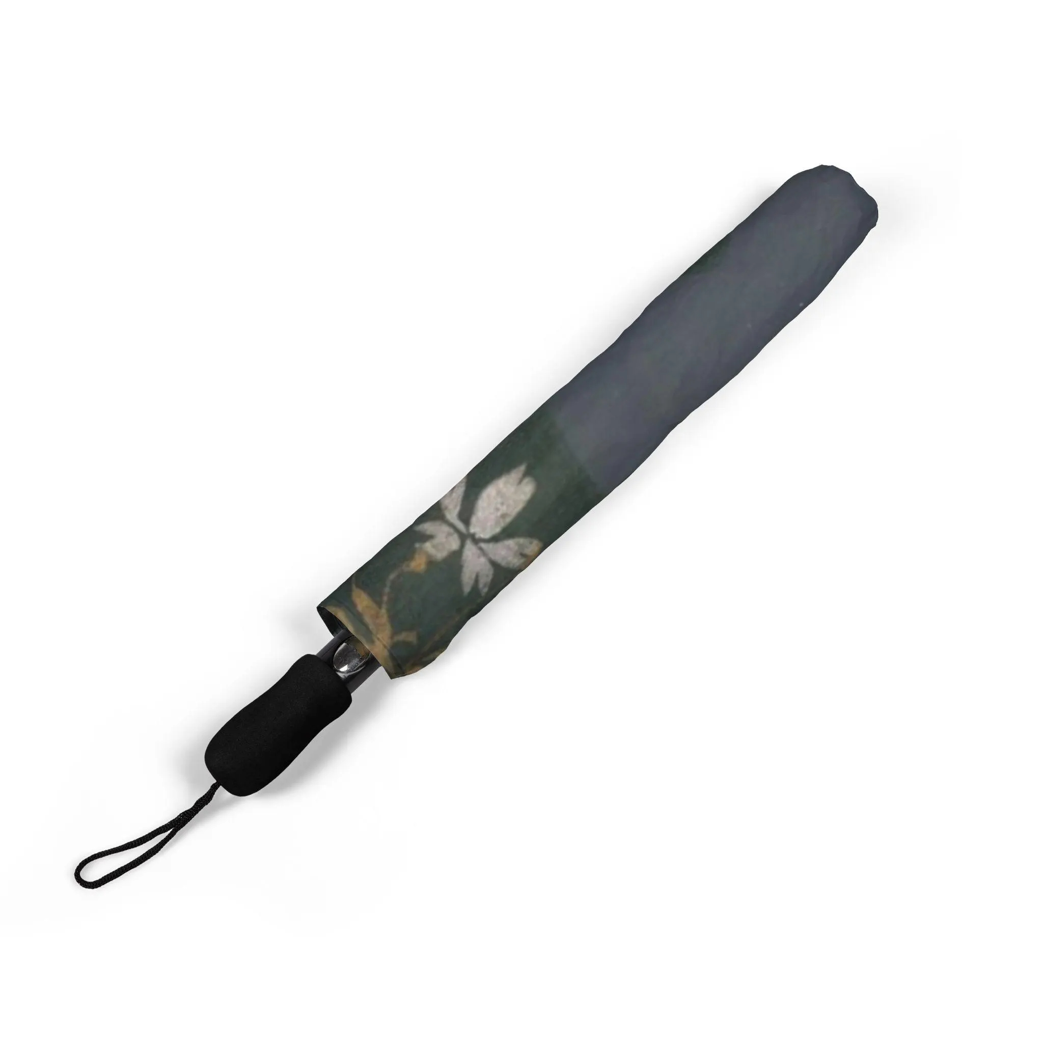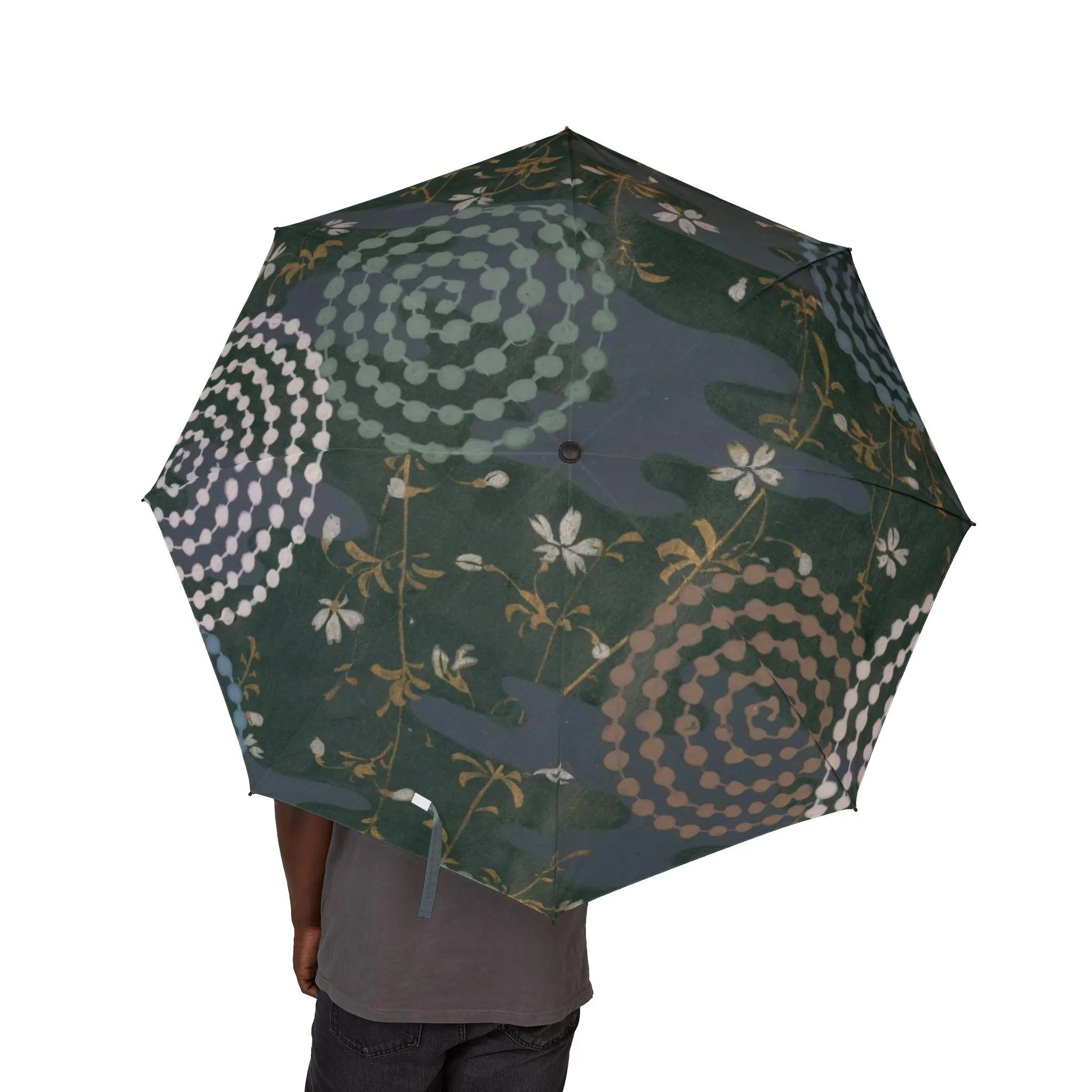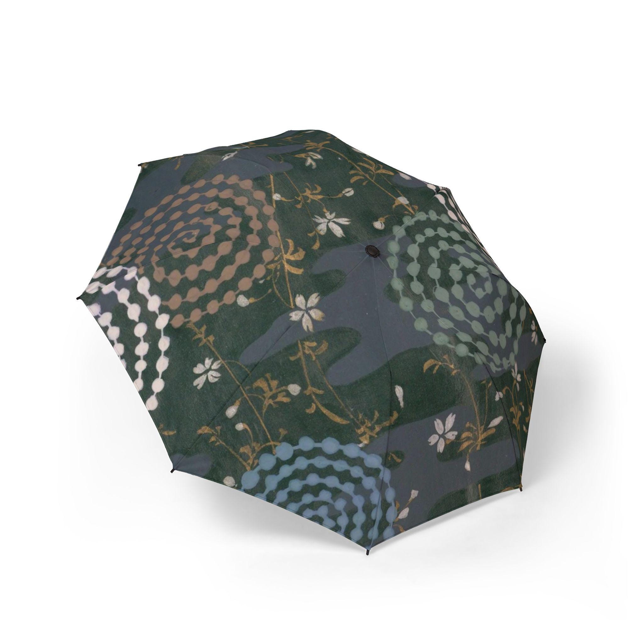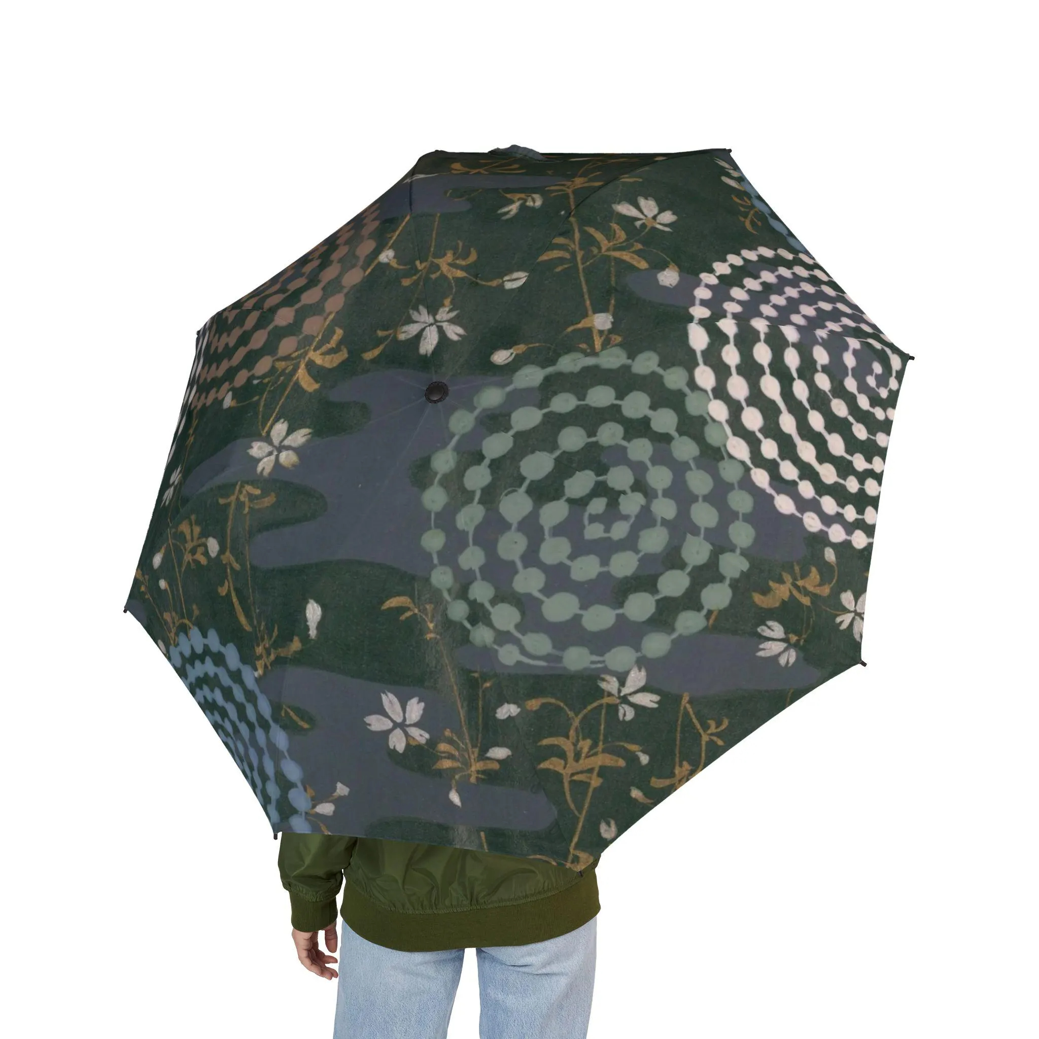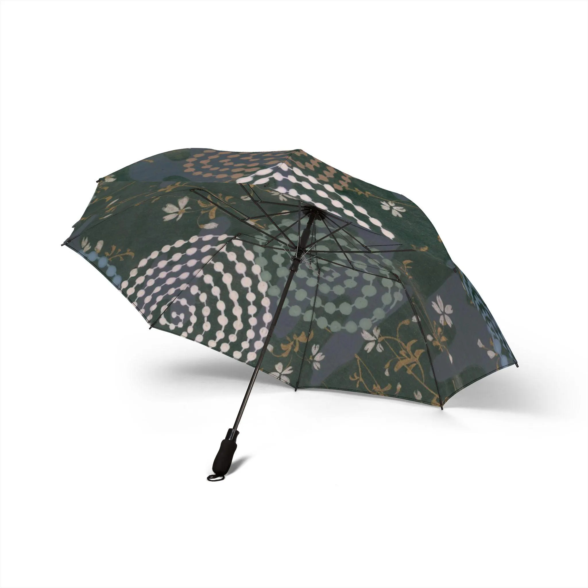 The umbrella surface reproduces the traditional Japanese “Yuzen dyeing” pattern, dark green like the background color of old kimonos, with cloud patterns, round flowers, and golden branches, bringing the elegant daily life of the Heian-kyo courtyard into this mobile world.