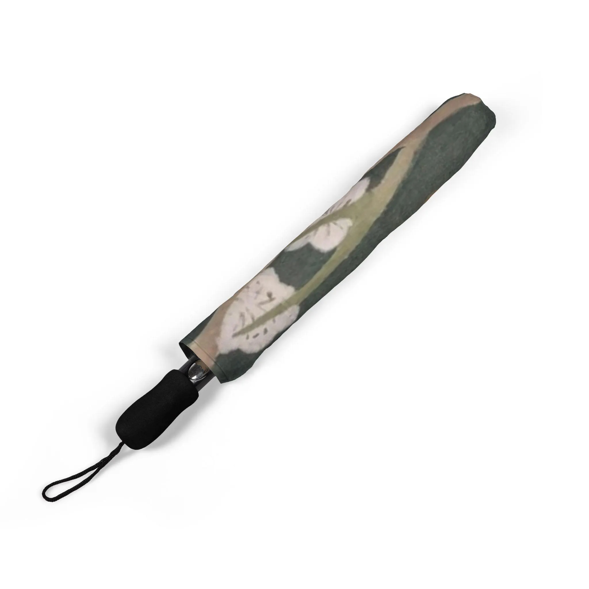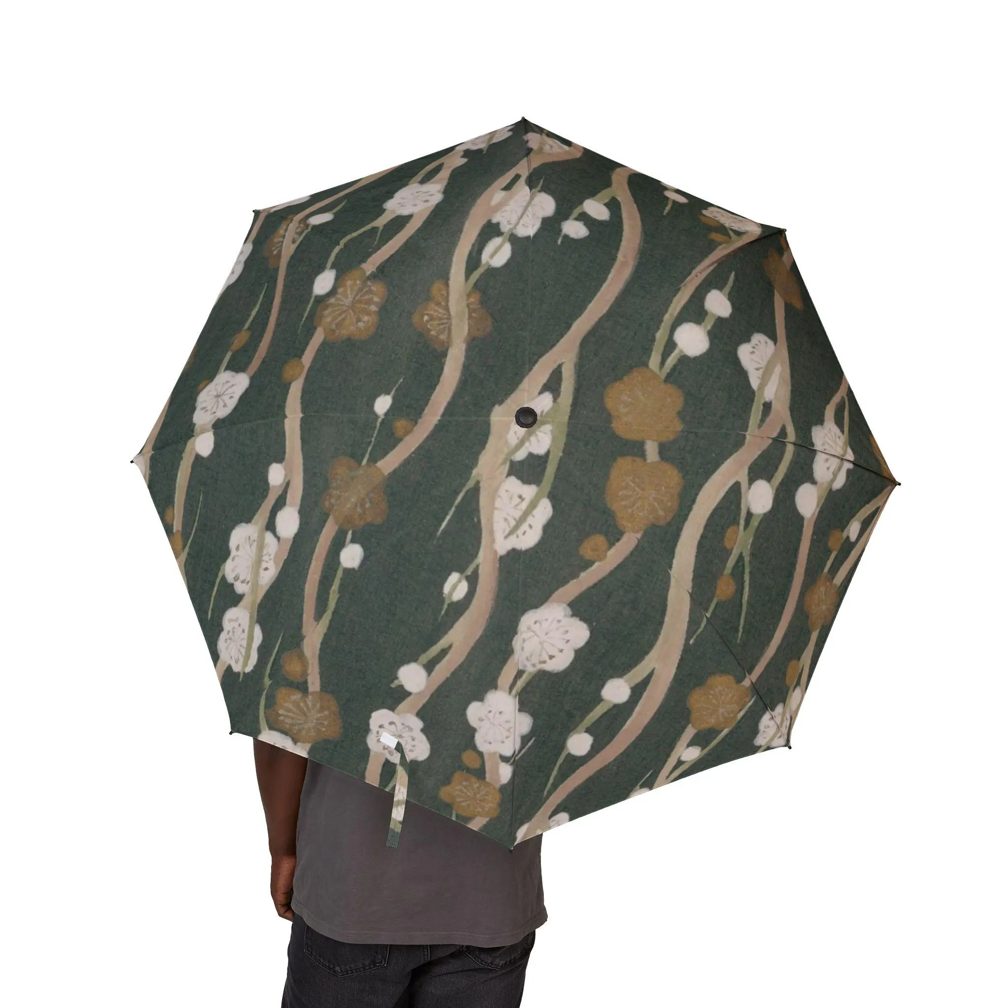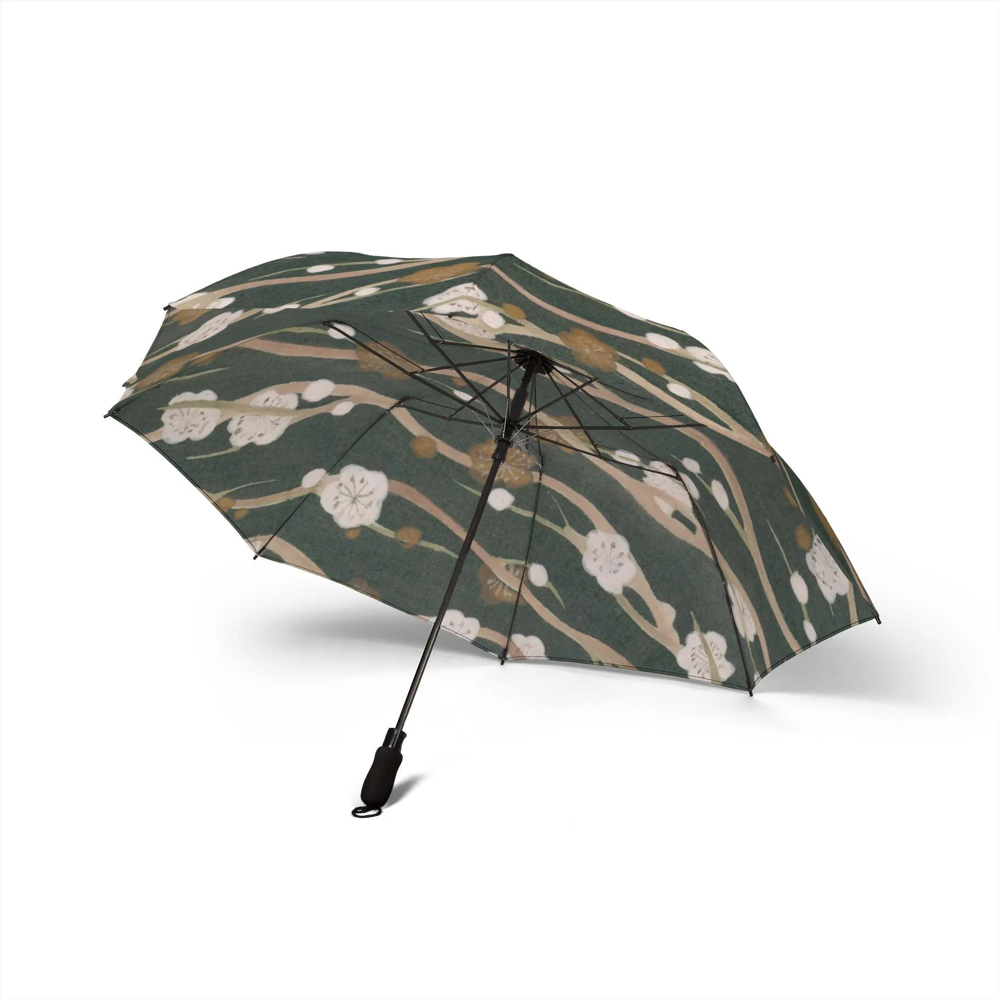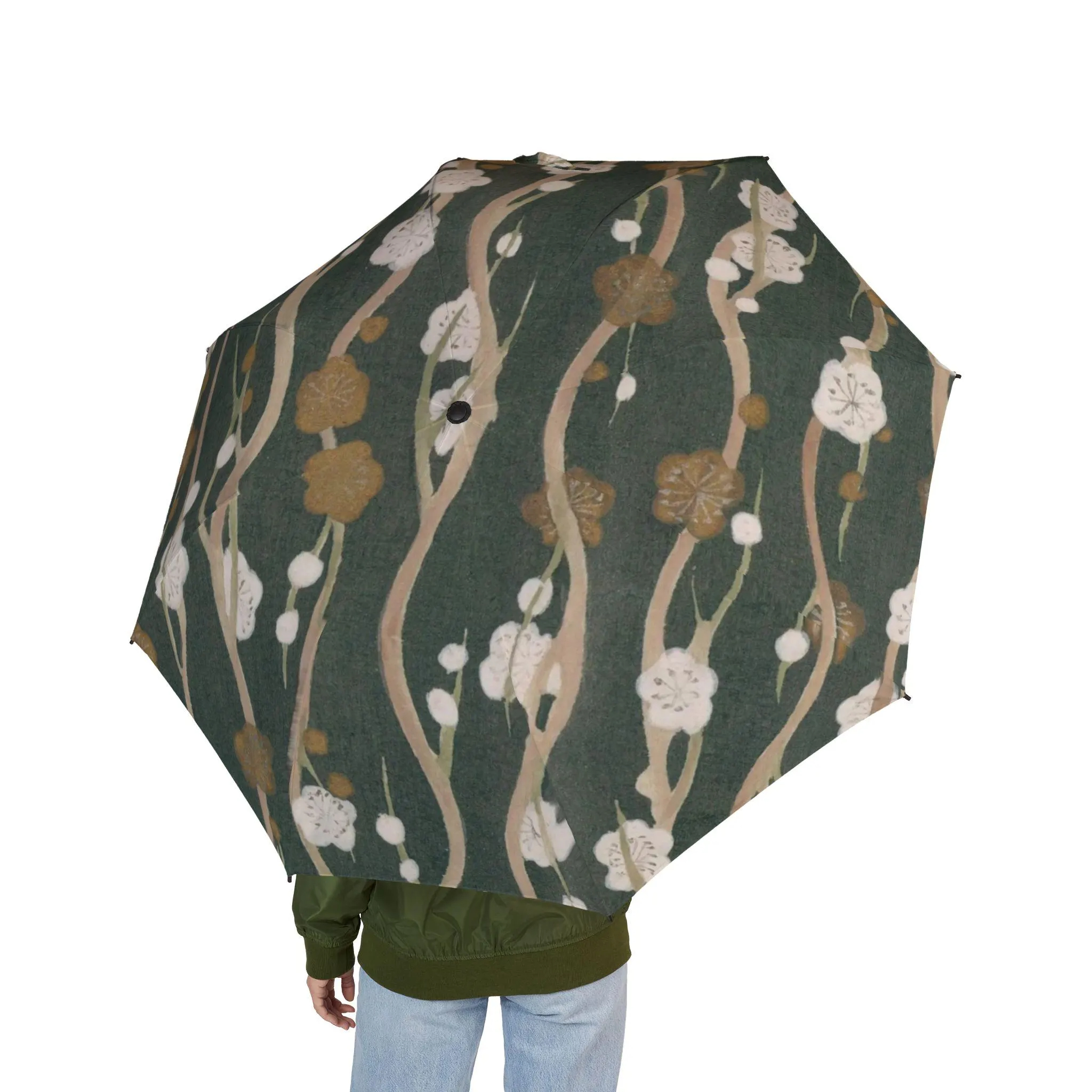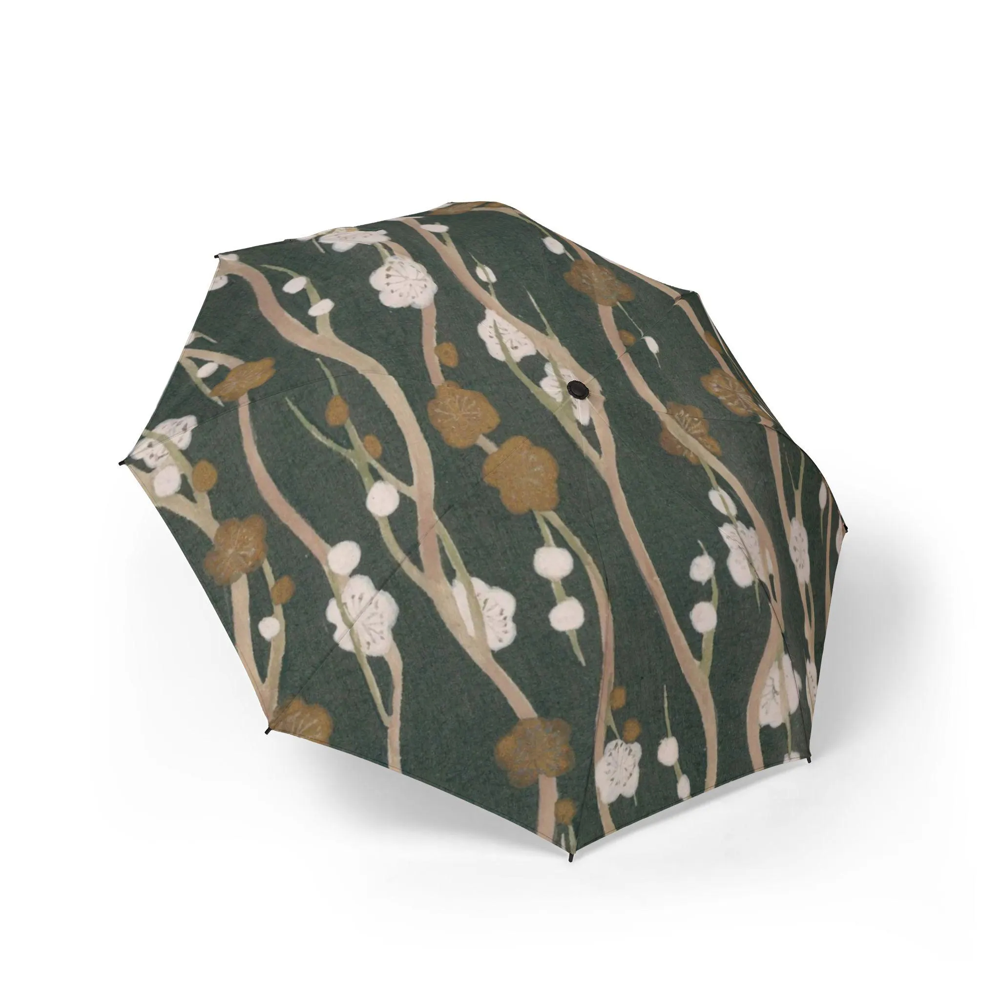 The umbrella surface reproduces the traditional Japanese “plum branch pattern”, with a dark green background like the ancient pine, and smudged with golden stamens, white plums, and green branches, bringing the winter elegance in the Kano school scroll into this mobile little world.