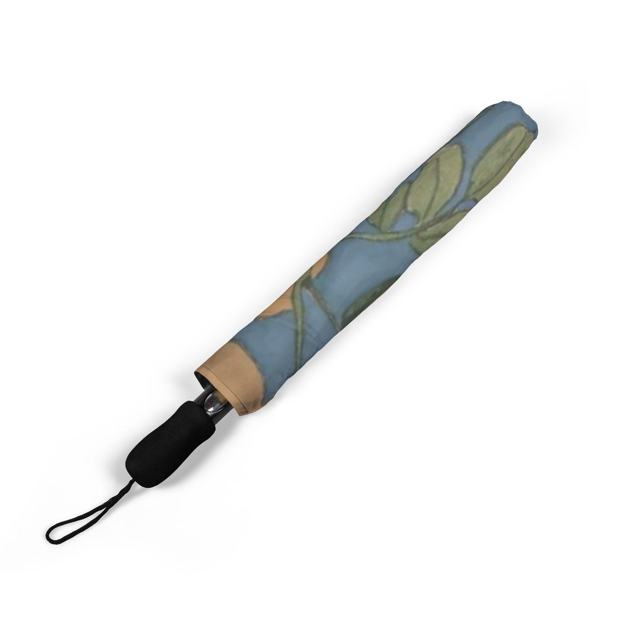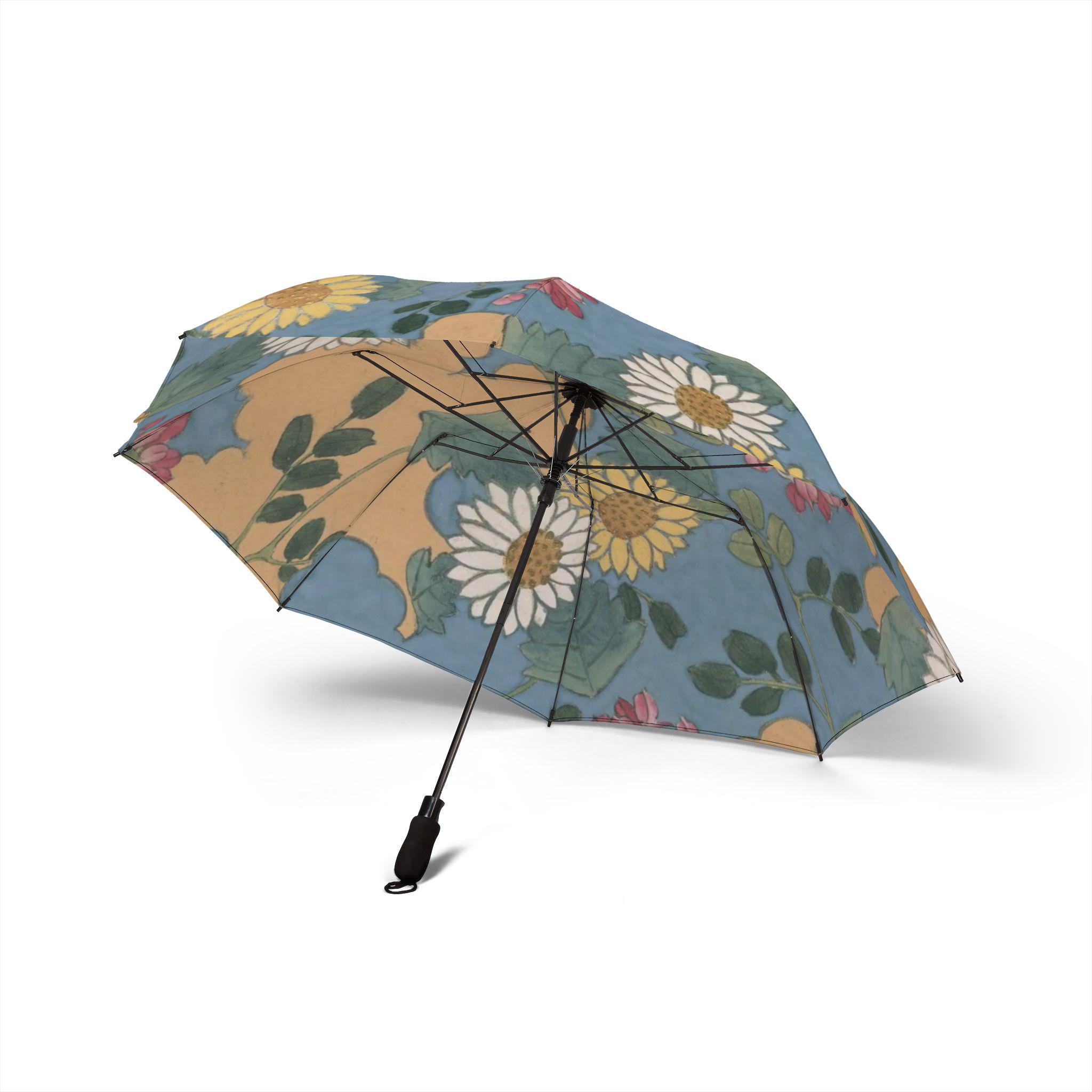 The umbrella surface reproduces the impressionist brushstrokes, taking the image of Monet’s garden – misty blue like the morning mist pond water, smudged with cream yellow flower clusters, mint green branches and leaves, pink and purple flowers like water lilies just blooming, bringing the hazy poetry of the Seine River into this mobile little world.