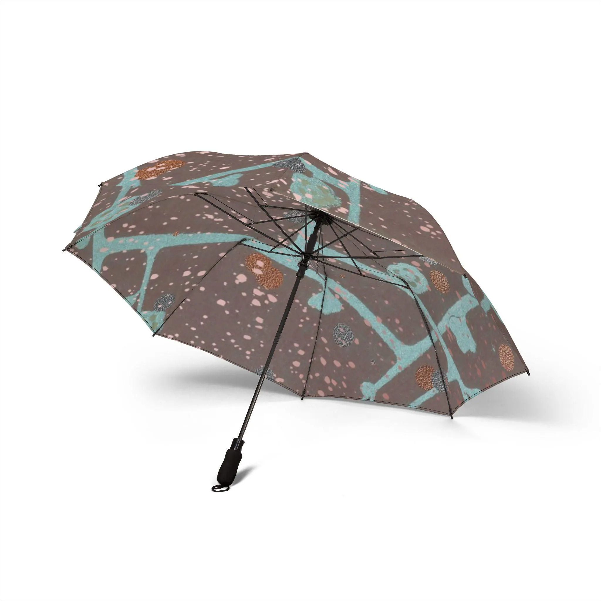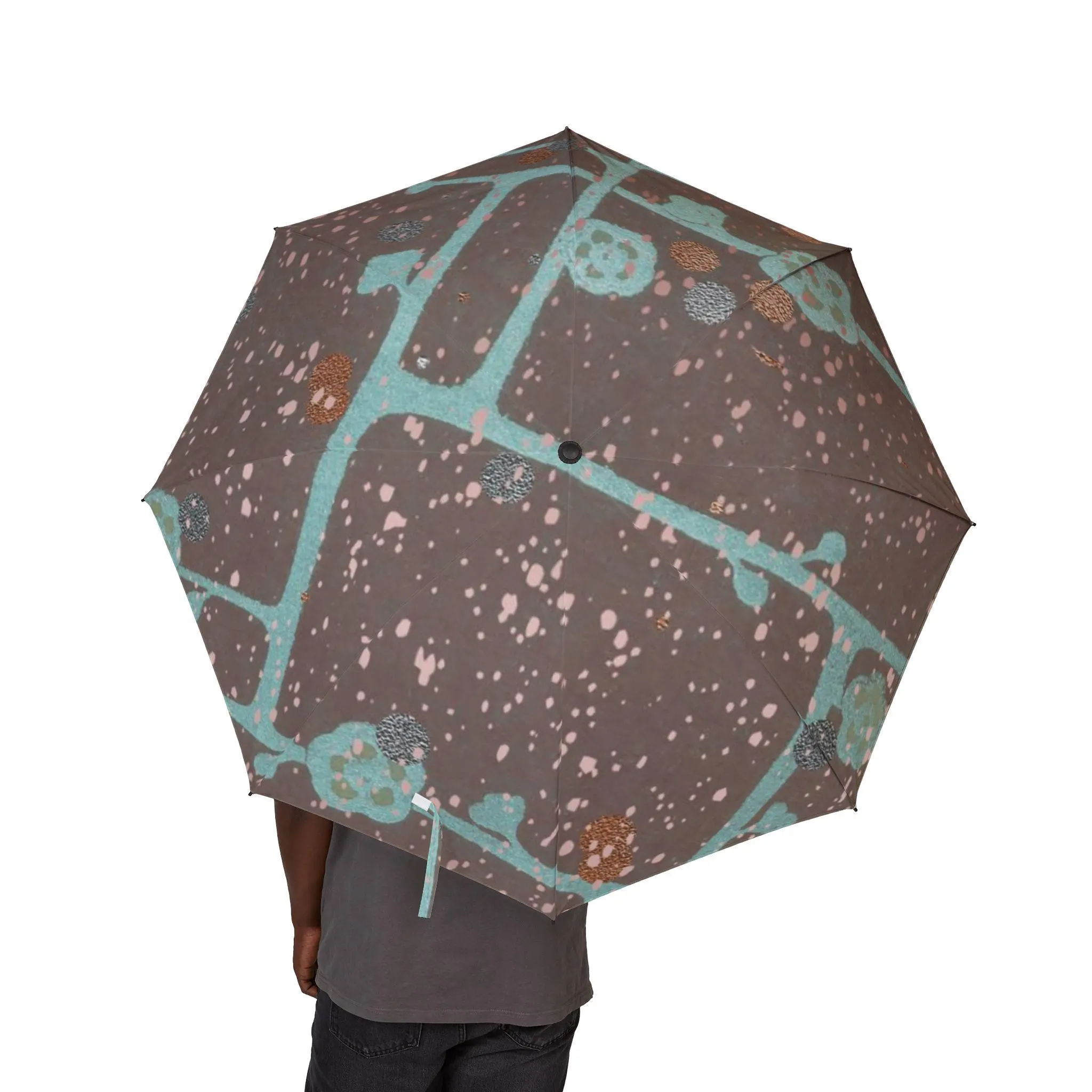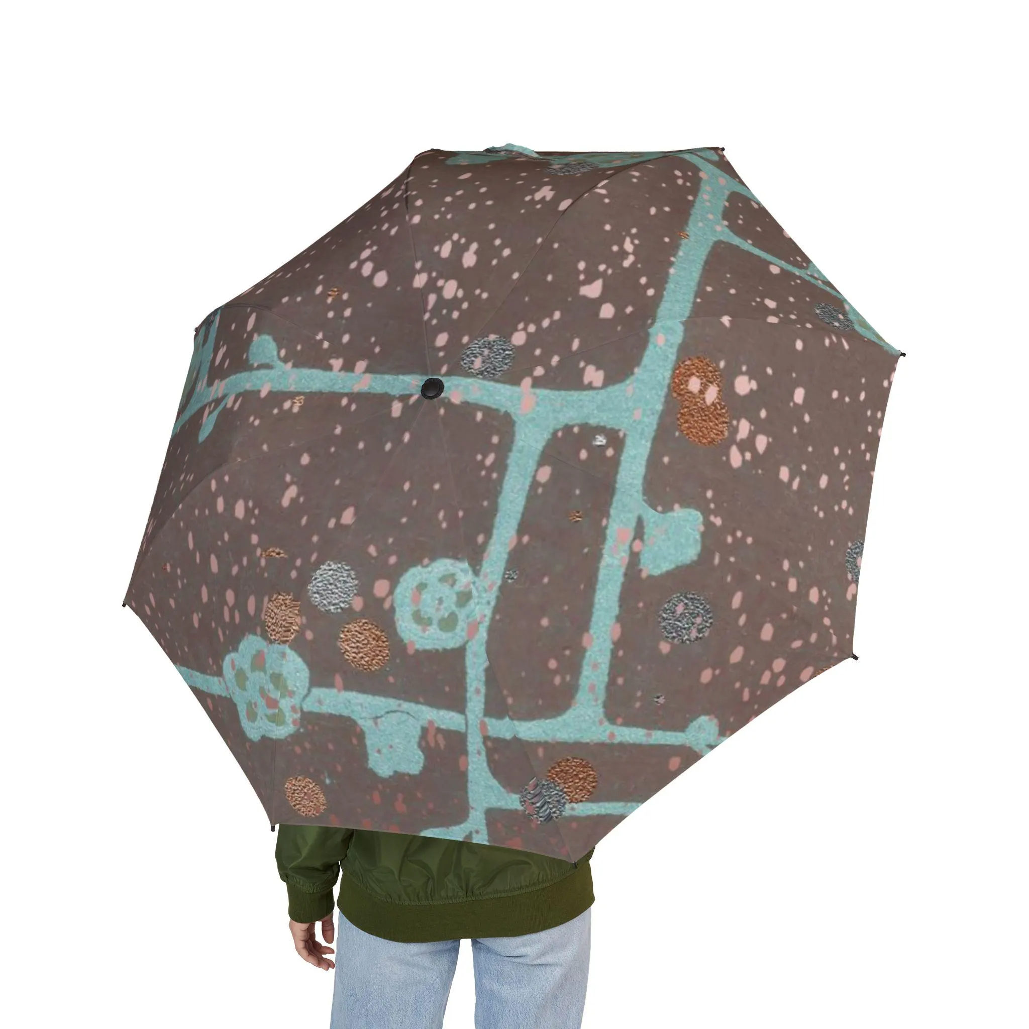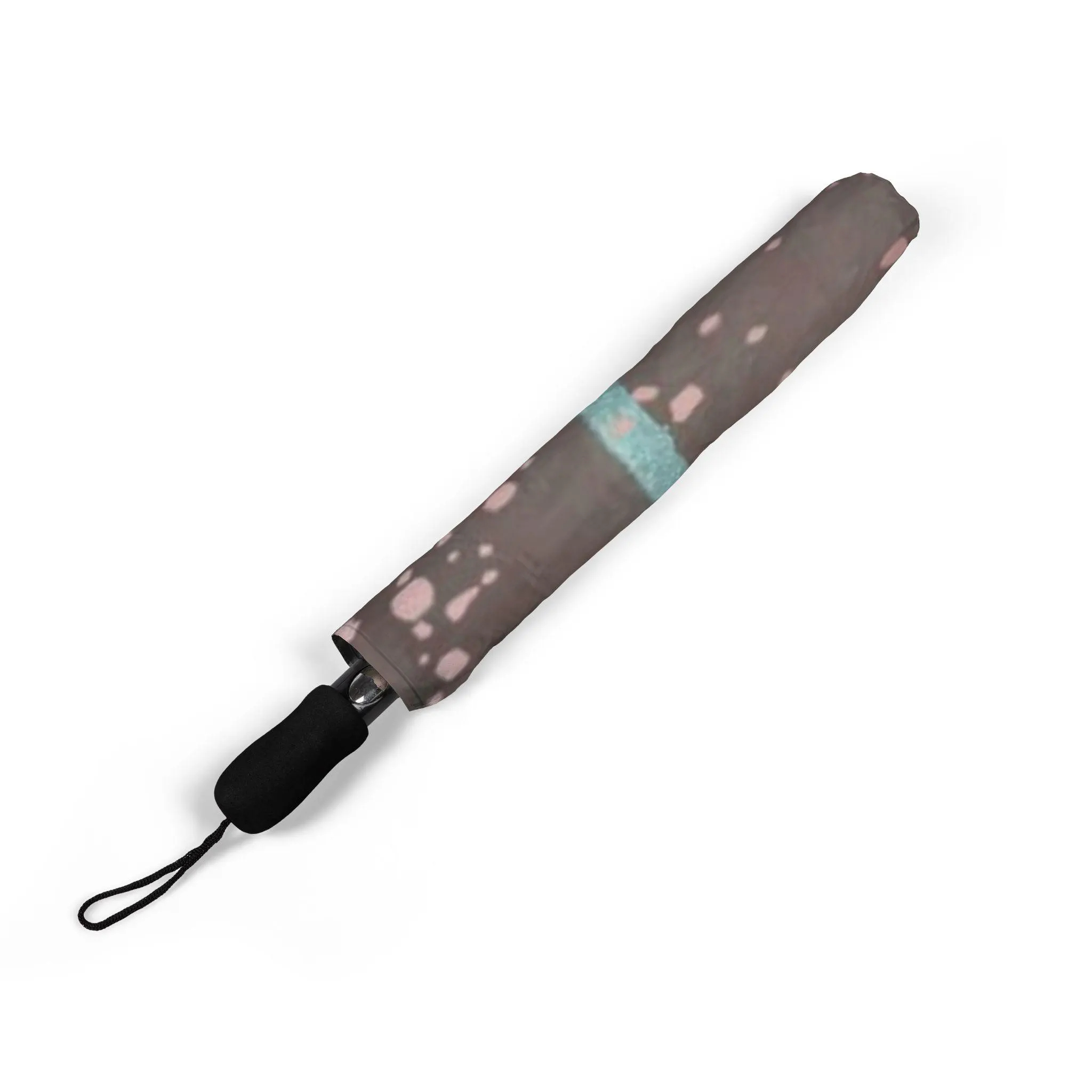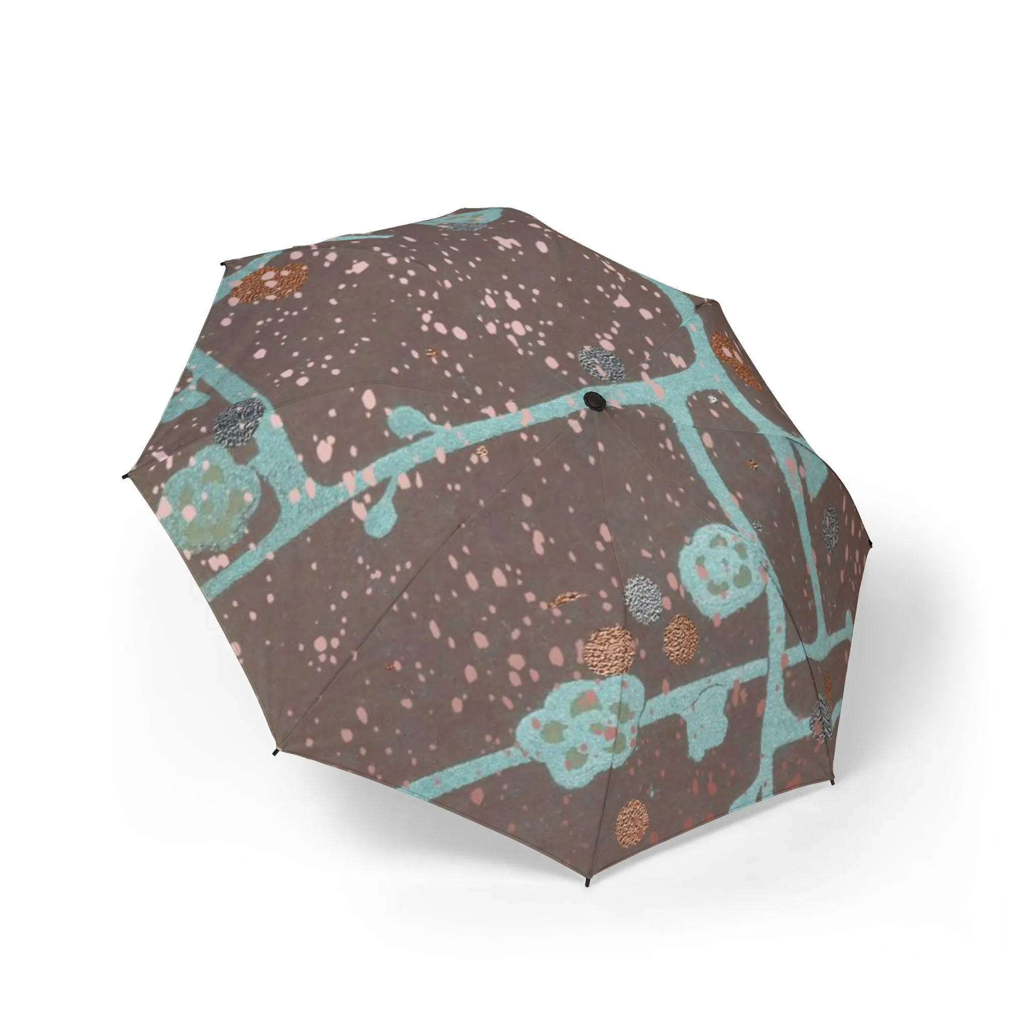 Artistic print design: dark brown umbrella surface as the base, light blue branches and vines winding, pink dots falling like drizzle, with colorful flowers of various shapes, it seems to move retro oil paintings onto the umbrella surface, open it to have a unique artistic atmosphere, and turn the daily umbrella into a literary symbol in your outfit in seconds.